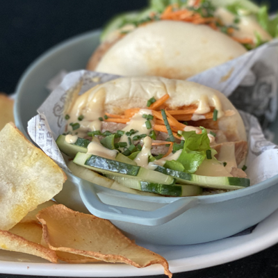 Bao de solomillo ibérico con salsa hoisin y chips de verduras
