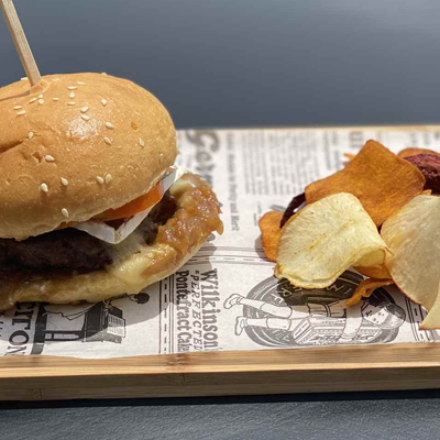 Hamburguesa Sabatini de ternera con cebolla caramelizada, tomate, queso brie y mahonesa trufada acompañada de chips de verdura.
