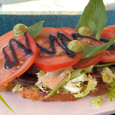 Tosta Vegetariana de queso brie con tomate, guacamole y reducción de aceto balsámico