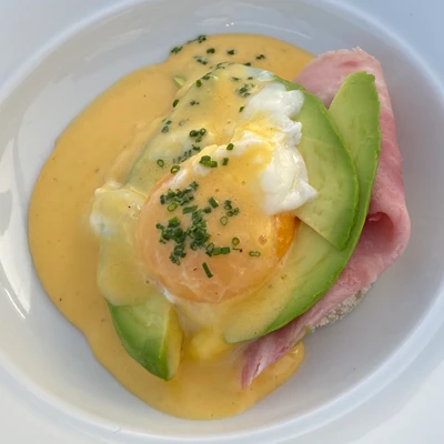Huevos Benedictine sobre tosta con aguacate, salsa holandesa y salmón o jamón york según tu gusto